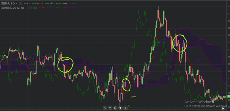 La imagen muestra varias situaciones marcadas con círculos donde el precio interactúa con la nube (Kumo), la Tenkan-Sen, la Kijun-Sen y la Chikou Span. Cada círculo representa un tipo de comportamiento que ayuda a identificar las mejores entradas y las zonas donde se debe evitar operar.
