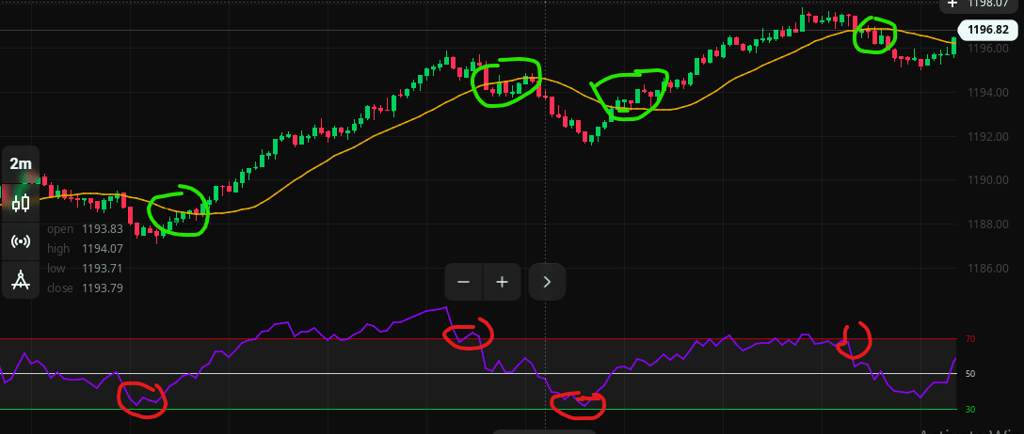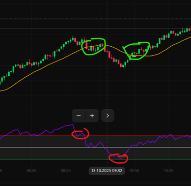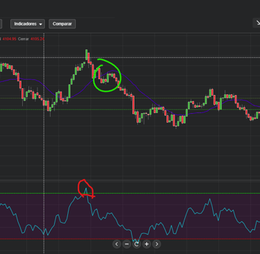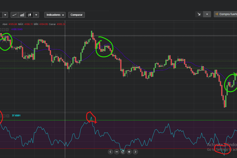 🔹 En la parte inferior, los círculos rojos muestran cómo el indicador de fuerza confirma que el mercado está agotado: ya sea por sobrecompra o sobreventa.